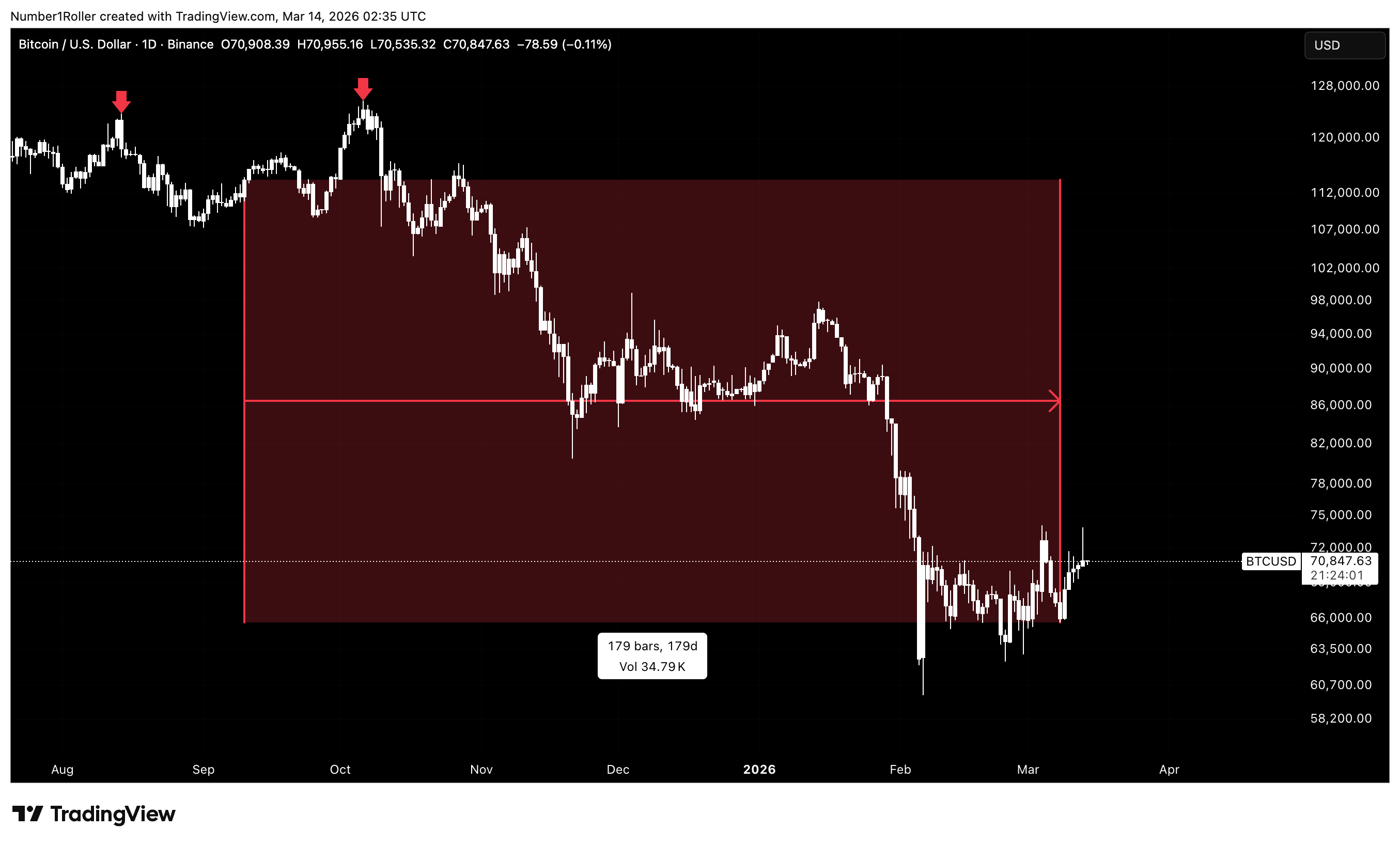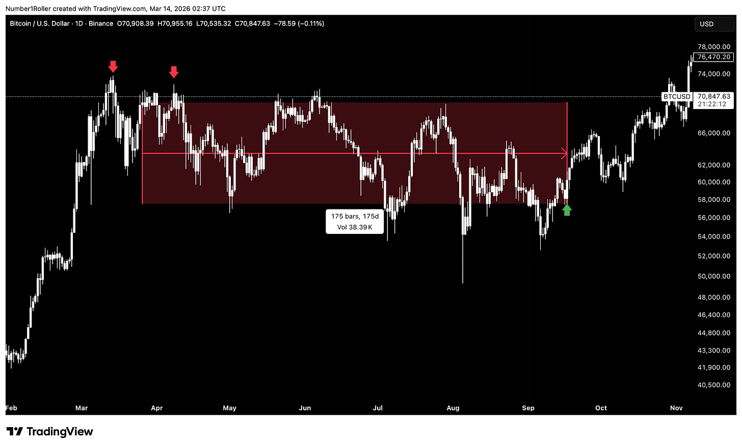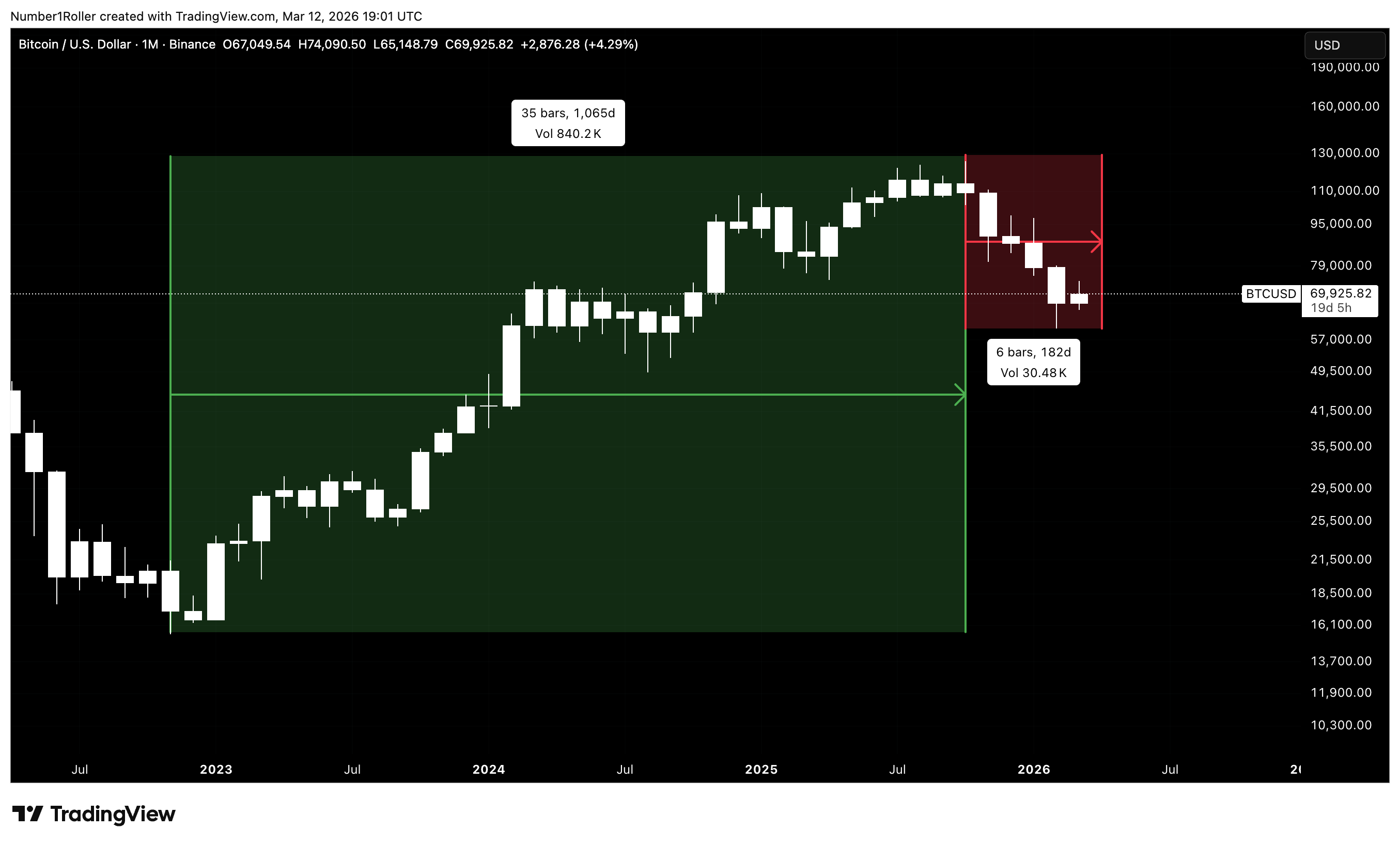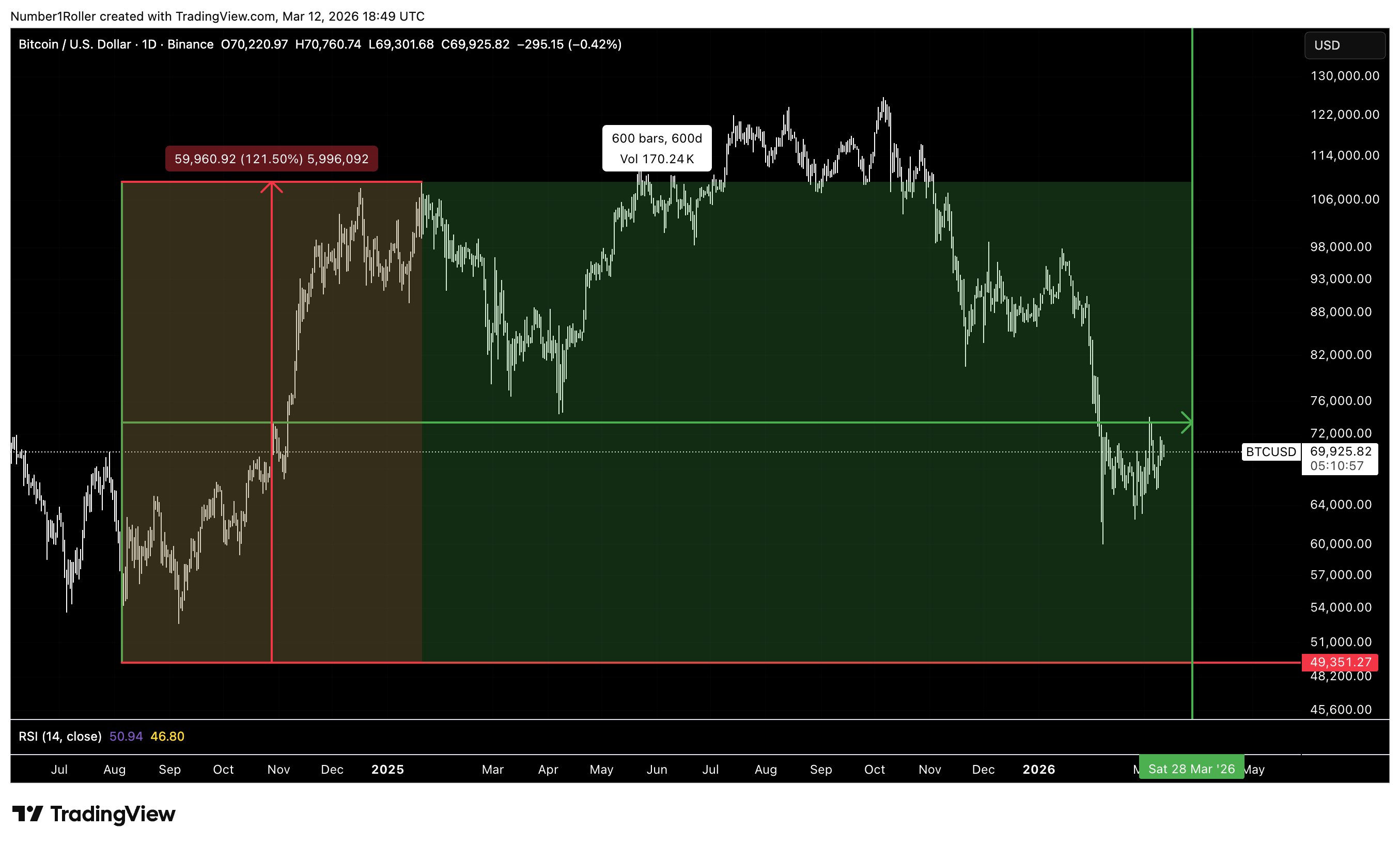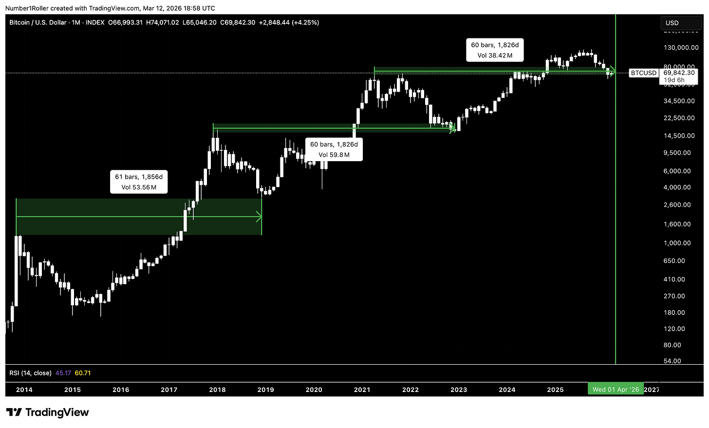 We can also square the range from the August 2024 bottom to the January 2025 top. That range measured 59,960 points — essentially 60,000.