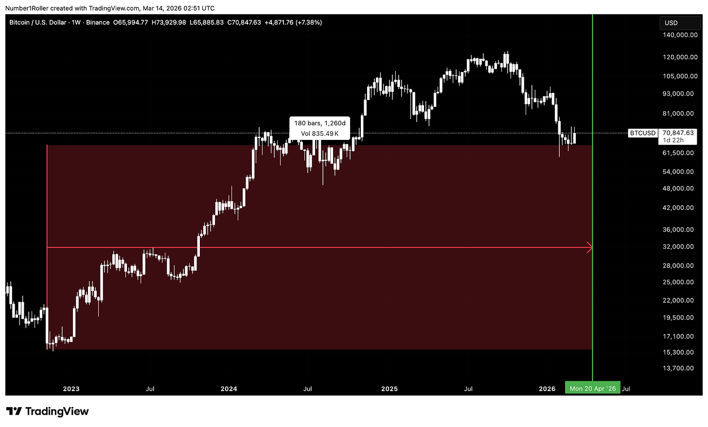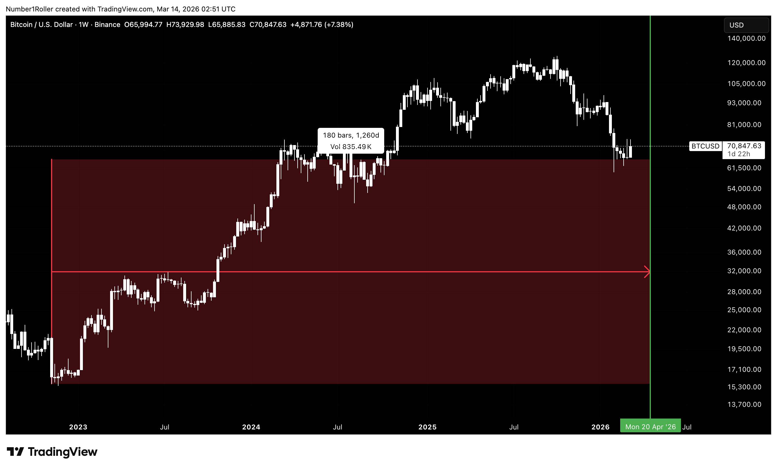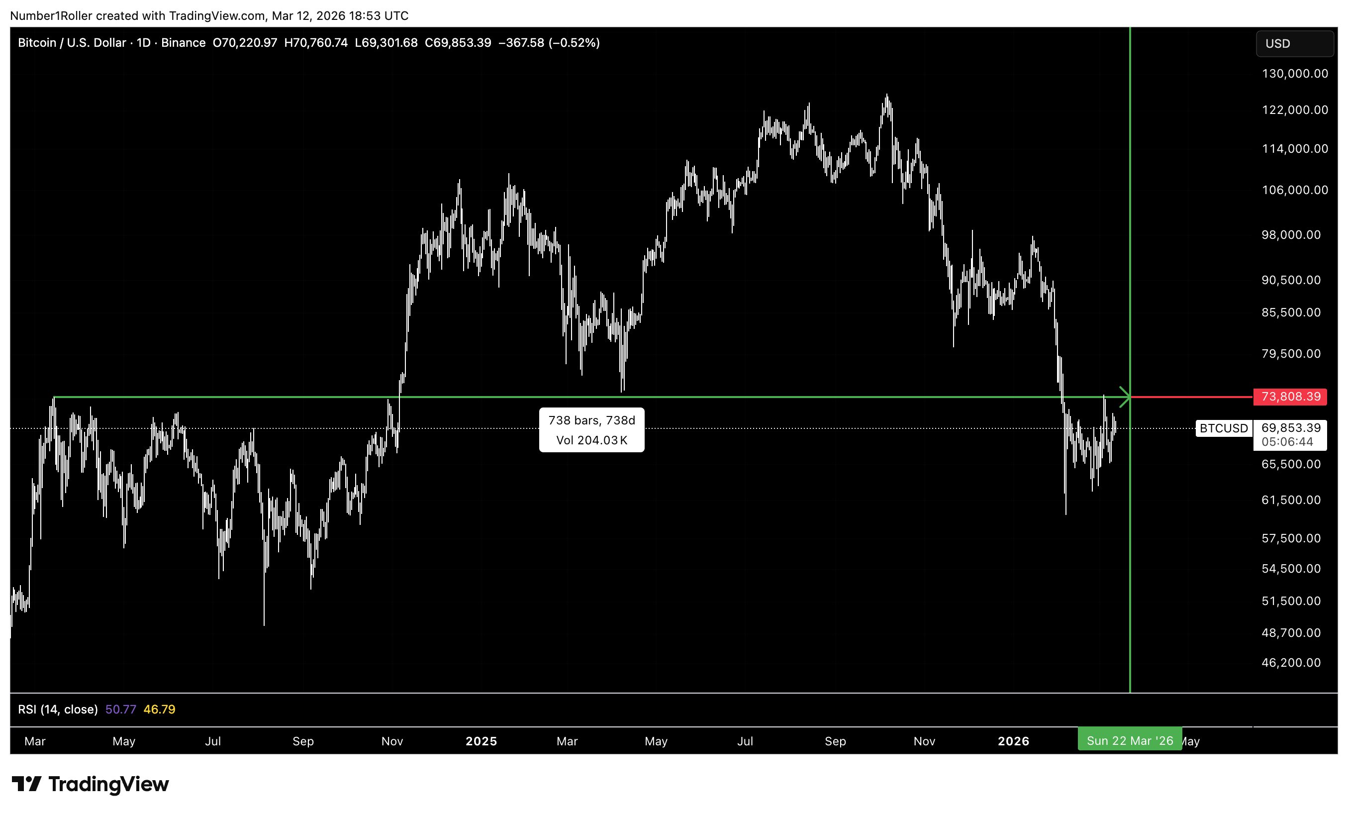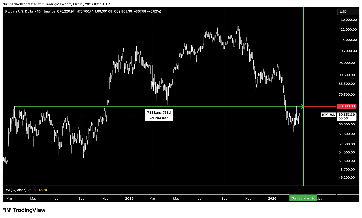 Let’s start with the March 13, 2024 top, which came in at 73,808. Sunday, March 22nd will mark 738 days from that date.