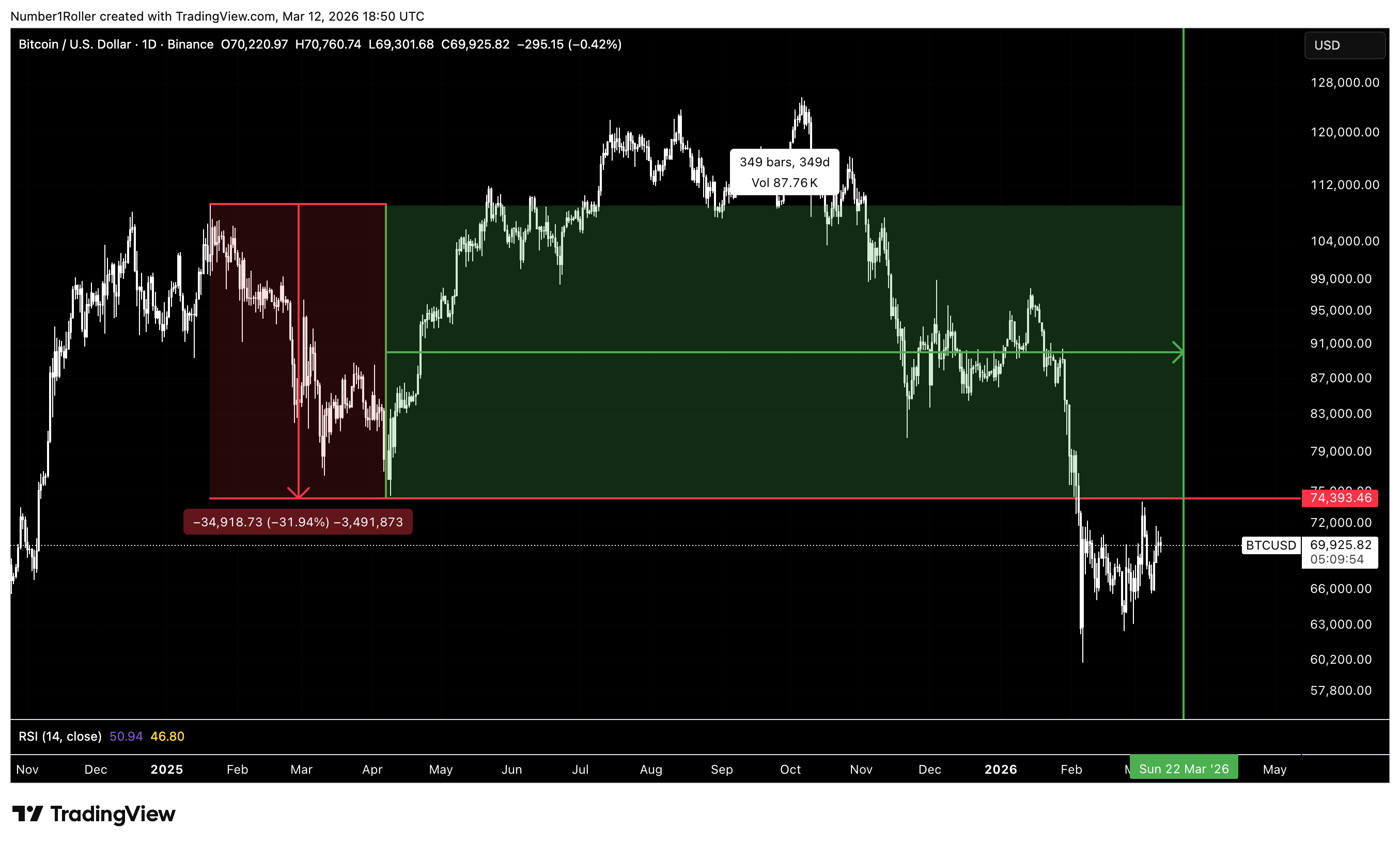 Next, we can square the range from the January 2025 top to the April 2025 low. That decline measured 34,918 points, which translates into a 349-day time window, landing again around March 22nd.