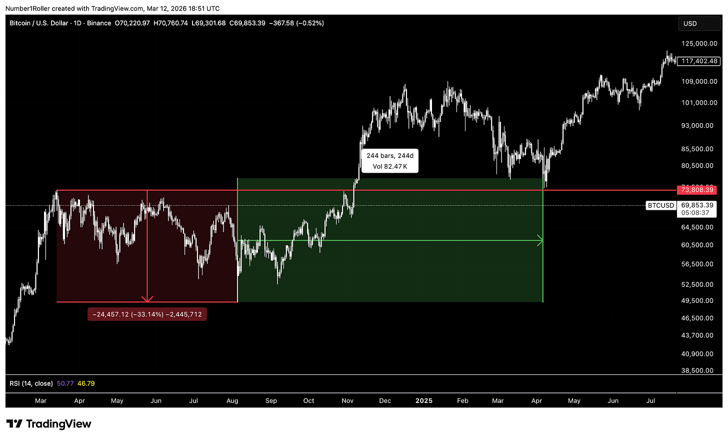 That drop measured 24,457 points. Rounded to 245 days, it lands on the exact date of the April 2025 bottom.